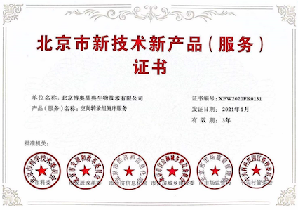 “北京市新技術(shù)新產(chǎn)品(服務(wù))認(rèn)定”旨在推動高新技術(shù)產(chǎn)業(yè)的發(fā)展,作為北京市新技術(shù)新產(chǎn)品,應(yīng)擁有自主知識產(chǎn)權(quán),并具有技術(shù)先進(jìn)性和創(chuàng)新性。本次喜獲“空間轉(zhuǎn)錄組測序服務(wù)”榮譽證書是各委員會對博奧晶典創(chuàng)新能力的高度贊揚和肯定,同時體現(xiàn)了博奧晶典空間轉(zhuǎn)錄組測序服務(wù)在行業(yè)內(nèi)的技術(shù)優(yōu)勢。