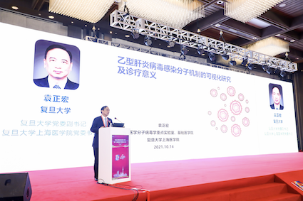 復旦大學黨委副書記、復旦大學上海醫(yī)學院黨委書記袁正宏教授作了題為《乙型肝炎病毒感染分子機制的可視化研究及診療意義》的專題報告。報告介紹了研究團隊利用基于 bDNA 的熒光原位雜交結合免疫熒光技術及 CRISPR-Tag 活細胞實時熒光失蹤技術,系統(tǒng)性地建立了在體外細胞和組織系統(tǒng)進行原位雜交加熒光、顯色檢測HBV核酸和蛋白可視化的方法。通過可視化技術,研究團隊在亞細胞水平直接觀察到HBV病毒組分,揭示了HBV病毒部分關鍵復制環(huán)節(jié)的細節(jié),填補了HBV生活史一些關鍵環(huán)節(jié)的時空信息。在組織水平觀察到病毒核酸與蛋白的分布特征,反應肝臟內(nèi)HBV病毒的生活特征。課題組開發(fā)的可視化技術可以用來監(jiān)測慢乙肝患者抗病毒治療后病毒蛋白質和核酸,尤其 cccDNA 的清除情況,有助于臨床醫(yī)生制訂更好的治療方案,并可為指導開發(fā)新藥物提供幫助。