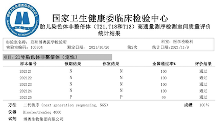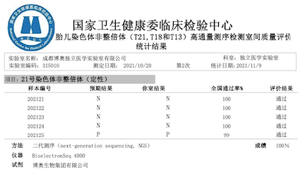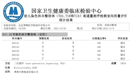 近日,國家衛(wèi)生健康委臨床檢驗中心發(fā)布了《2021年外周血胎兒染色體非整倍體(T21,T18和T13)高通量測序檢測室間質(zhì)量評價結(jié)果》,博奧晶典旗下北京、廣東、成都等11家檢驗實驗室全滿分通過。