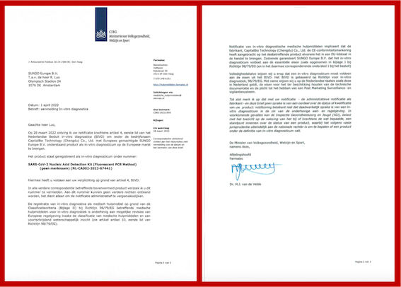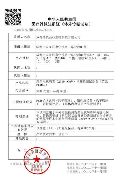 2022年11月4日,博奧晶典新冠病毒核酸檢測整體解決方案再添新成果,凍干型高靈敏度的新型冠狀病毒(2019-nCoV)核酸檢測試劑盒 (熒光PCR法)正式獲得醫(yī)療器械注冊證(國械注準(zhǔn):20223401469)。這是國家藥品監(jiān)督管理局審批通過的首個凍干型新冠病毒核酸檢測試劑盒,同時具備中國NMPA和歐洲CE“雙證”,為堅持“動態(tài)清零”,全面加強(qiáng)常態(tài)化疫情防控能力建設(shè)提供全新戰(zhàn)疫利器。
