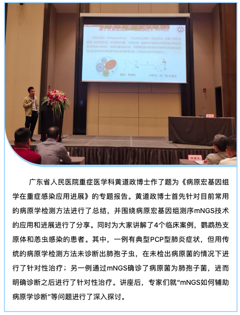 日前,福建省重癥醫(yī)學(xué)培訓(xùn)會(huì)——中國(guó)重癥醫(yī)學(xué)多學(xué)科精髓(MCCRC)培訓(xùn)班在福州召開(kāi)。本次培訓(xùn)班邀請(qǐng)了省內(nèi)外知名專家圍繞重癥醫(yī)學(xué)領(lǐng)域新技術(shù)的發(fā)展等內(nèi)容進(jìn)行了專題報(bào)告,其中,廣東省人民醫(yī)院重癥醫(yī)學(xué)科黃道政博士及博奧晶典產(chǎn)品總監(jiān)劉瑩瑩博士受邀出席,并作了題為“病原宏基因組學(xué)在重癥感染應(yīng)用進(jìn)展”和“病原宏基因組學(xué)報(bào)告解讀”的專題報(bào)告,報(bào)告受到福建省醫(yī)學(xué)會(huì)重癥醫(yī)學(xué)分會(huì)主任委員、福建醫(yī)科大學(xué)附屬第一醫(yī)院ICU主任林建東教授的支持與點(diǎn)評(píng)。