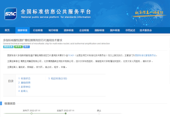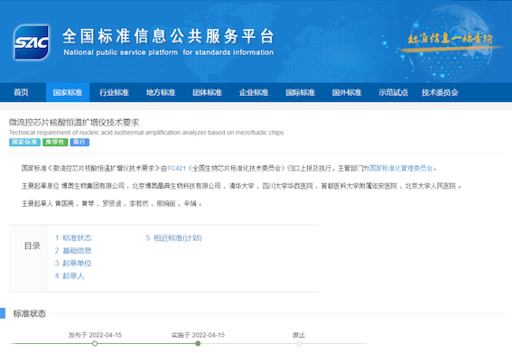 近日,國家市場監(jiān)督管理總局、國家標(biāo)準(zhǔn)化管理委員會發(fā)布《中華人民共和國國家標(biāo)準(zhǔn)公告》2022年第6號和第8號,由博奧生物集團有限公司主導(dǎo)制定的國家標(biāo)準(zhǔn)《微流控芯片核酸恒溫擴增儀技術(shù)要求》(GB/T 41407-2022),《多指標(biāo)核酸恒溫擴增檢測微流控芯片通用技術(shù)要求》(GB/T 41521-2022)獲準(zhǔn)頒布,分別于2022年4月15日、2022年7月11日起正式實施。兩項新標(biāo)準(zhǔn)的頒布完善了我國核酸擴增檢測技術(shù)領(lǐng)域的標(biāo)準(zhǔn)內(nèi)容,使相關(guān)技術(shù)所涉及產(chǎn)品應(yīng)用與服務(wù)更加規(guī)范、具有較強的指導(dǎo)性。