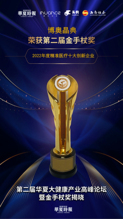 歲末年初,博奧晶典憑借在精準(zhǔn)醫(yī)療領(lǐng)域的多項(xiàng)核心專利技術(shù)和高質(zhì)量創(chuàng)新產(chǎn)品,在近日由華夏時報社、蘭州新區(qū)管委會等單位共同主辦的第二屆華夏大健康產(chǎn)業(yè)高峰論壇暨金手杖獎頒獎盛典上喜獲“2022年度精準(zhǔn)醫(yī)療十大創(chuàng)新企業(yè)”。此次獲得2022年度精準(zhǔn)醫(yī)療十大創(chuàng)新企業(yè),是對博奧晶典科技創(chuàng)新能力的充分肯定,亦是對博奧晶典行業(yè)龍頭地位的高度認(rèn)可。