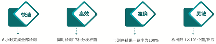采用生物芯片技術(shù)將序列已知的寡聚核苷酸探針分子固定于芯片基片,然后與待檢標本中標記的核酸進行分子雜交,通過檢測每個探針分子的雜交信號強度,對17種臨床常見分枝桿菌進行快速鑒定,從而準確鎖定致病菌種類型。該試劑盒是國內(nèi)第一批獲得CFDA認證的分枝桿菌快速菌種鑒定產(chǎn)品。